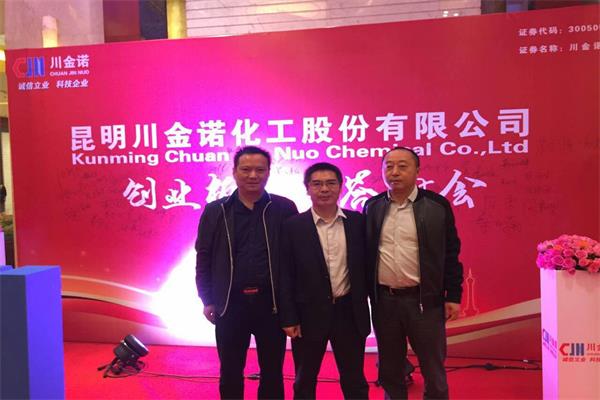 2016年10月31日晚,“昆明川金諾化工股份有限公司2016年上市答謝會暨MDCP新產品推薦會”在世紀金源大飯店一樓宴會廳隆重舉行,我司李宏斌總經理、何志強經理、姚勇經理參加會議。